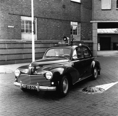 De Peugeot was de radiowagen van de vrijwilligers met de roepnaam AD 100. Hij werd bij elkaar gespaard door de 'Vereniging Amsterdamse Vrijwillige Politie' en in 1954 aan de reservisten aangeboden.